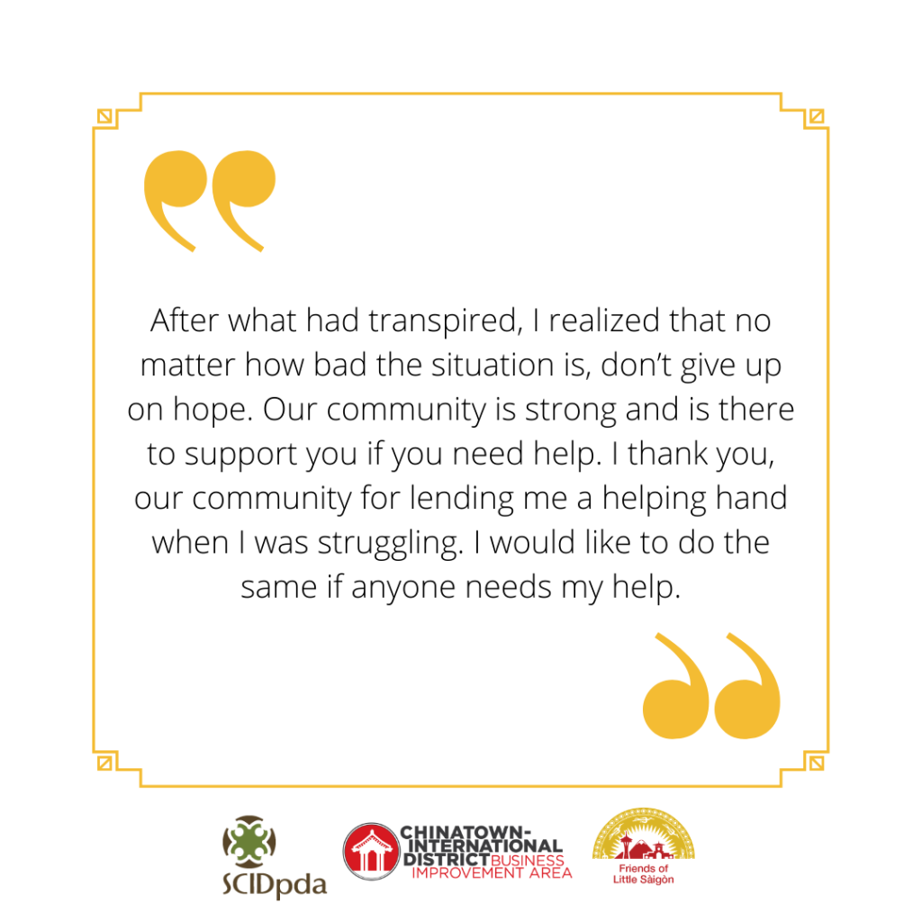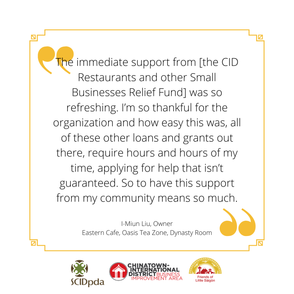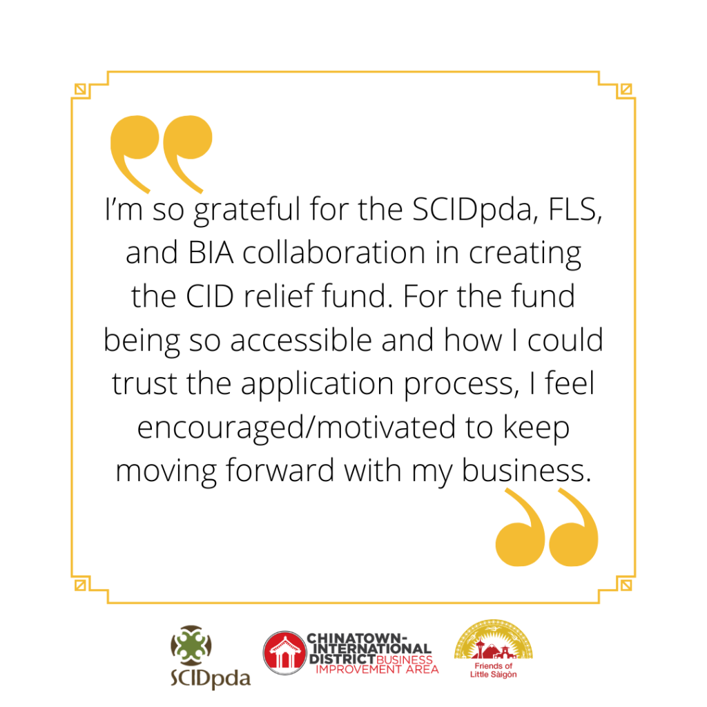 February 13, 2021: The CID Restaurants and other Small Businesses Relief Fund is now closed. (Donations are no longer solicited.) All money in the fund will be granted to qualified small businesses in the coming weeks. Please continue to patronize your favorite small businesses directly, as they will need your continued support during these difficult times. You can also directly support the organizations behind the CID Business Relief Team (Friends of Little Saigon, CID Business Improvement Area, and SCIDpda) as we continue to help our small businesses find resources and navigate the economic and health impacts of the COVID-19 pandemic. Thank you to everyone for your support of small businesses in the Chinatown International District. (Read the full announcement here.)