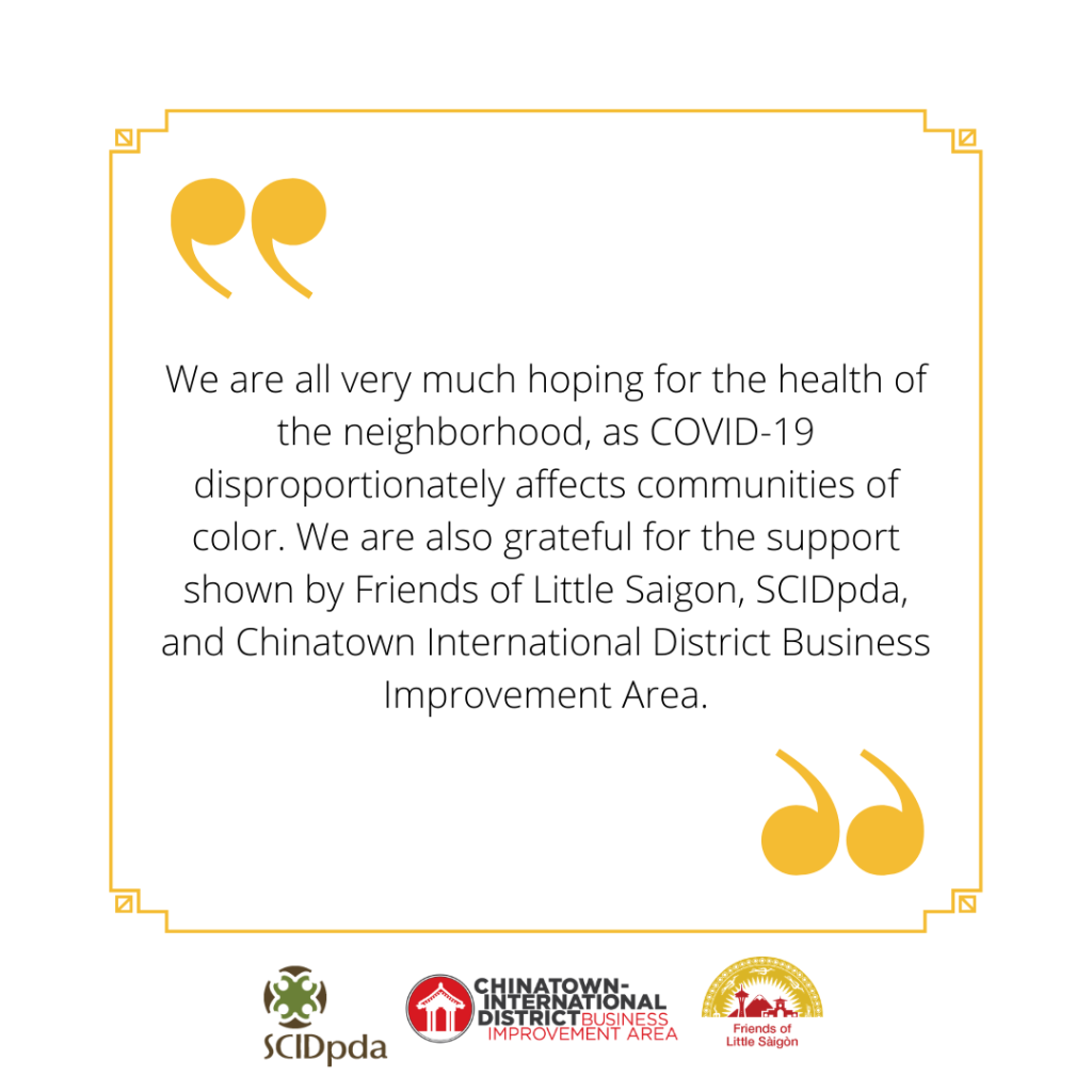 The CID Restaurants and other Small Businesses Relief Fund – managed and disbursed by the Chinatown International District Business Improvement Area, Friends of Little Saigon, and the Seattle Chinatown International District Preservation and Development Authority (the CID Business Relief Team) – will give direct dollars to the small businesses in the CID to help them mitigate the impacts of this pandemic. The fund was seeded by a generous $100,000 donation from Vulcan. This initial contribution will focus on restaurants in the neighborhood, which have seen a severe decline in business since early February. 100% of the relief fund will go directly to restaurants and other small businesses in the Chinatown International District (CID).
